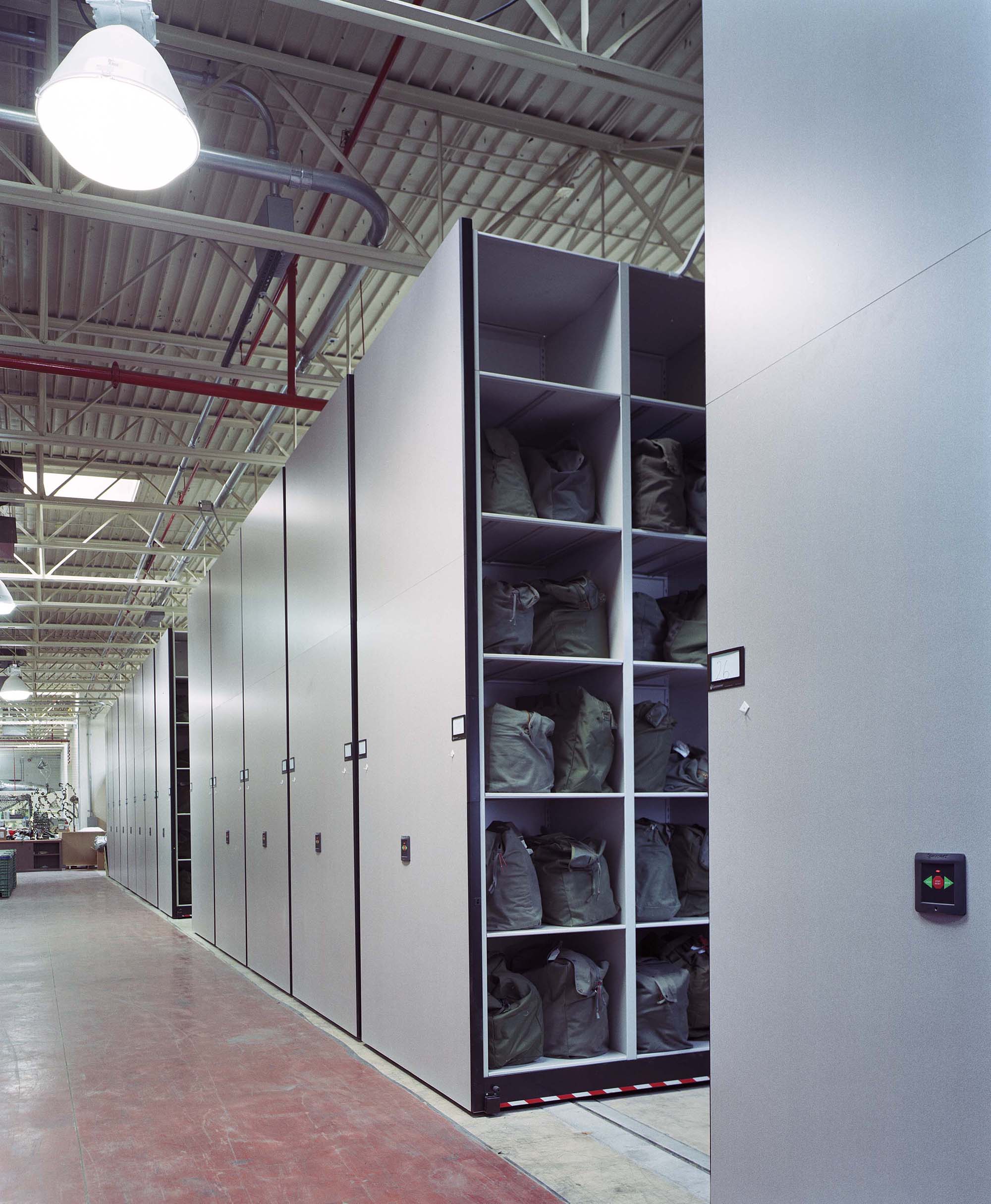 When it came to storing the bulky mobility bags, a high-density shelving system was the answer. By mounting shelves with dividers for each individual bag onto rails, static aisles were eliminated, which created space for all the bags to be stored in one central location. With the push of a button, the shelves easily move over 4,000 mobility bags, as well as space and back-up items for additional bags. Each Airman is assigned a bag and each bag is assigned a storage cubby within the system. The system eliminated the need for the storage bins so that now, during a deployment, bags are located and retrieved in a matter of minutes.