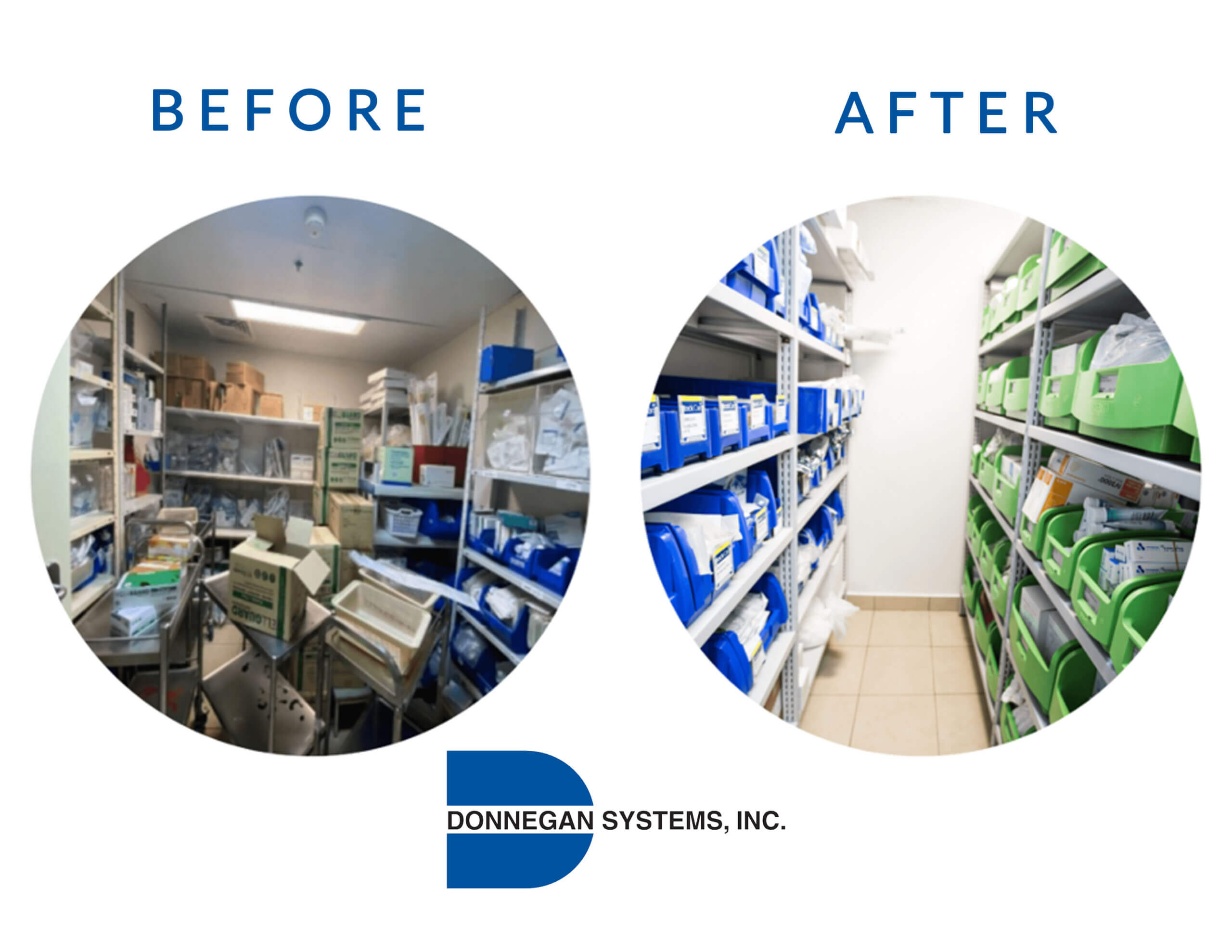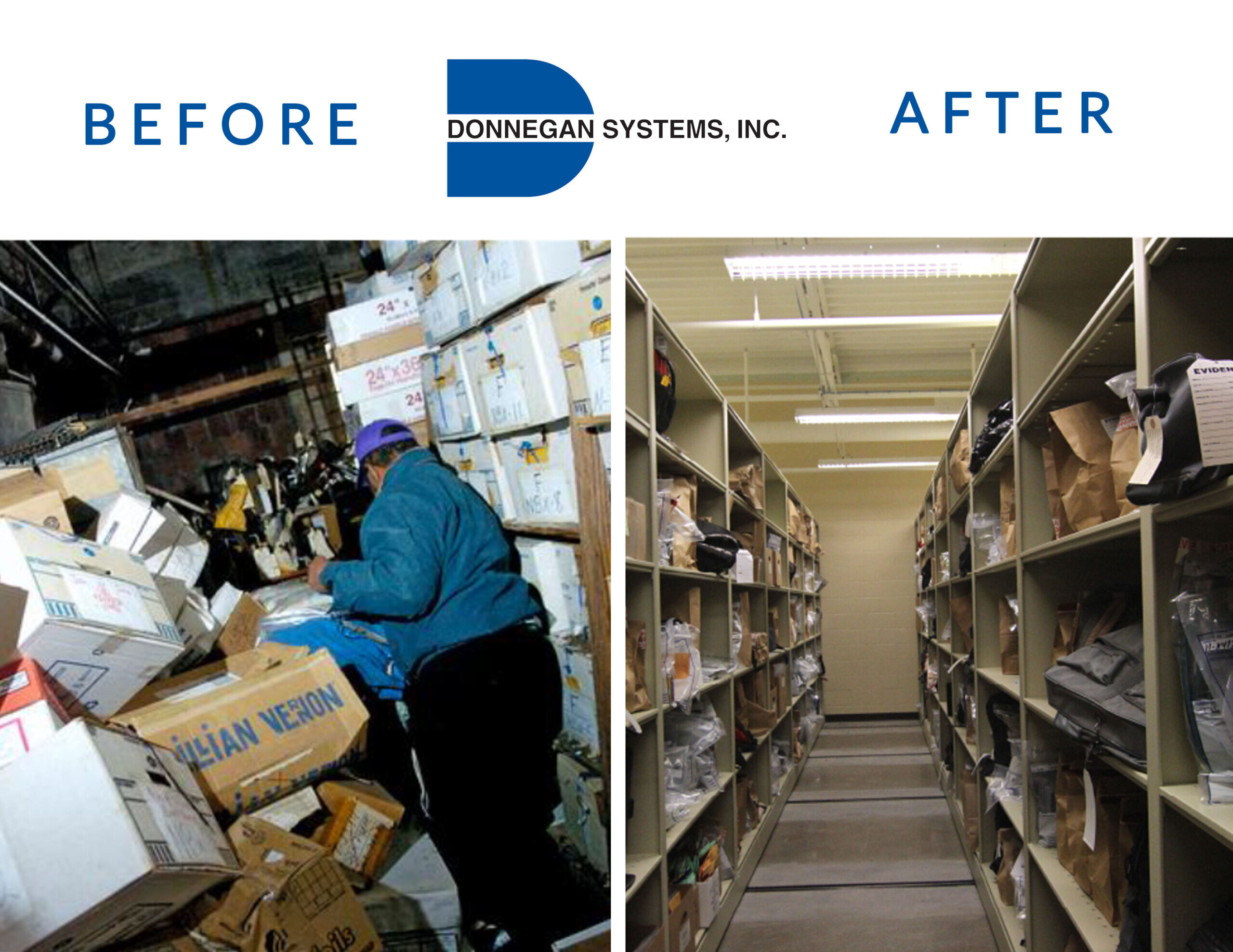 Donnegan Systems’ solutions are designed to maximize storage capacity and improve organization. With their innovative designs and space-saving features, our systems allow businesses and organizations to store more items in less space. Whether it’s high-density mobile shelving or vertical storage solutions, we provide storage solutions that help organizations make the most of their available storage space, ultimately saving them money and reducing the need for additional storage facilities. The below before-and-after images showcase just how important the proper storage and shelving can be and how we can help transform your space and resolve your storage challenges.