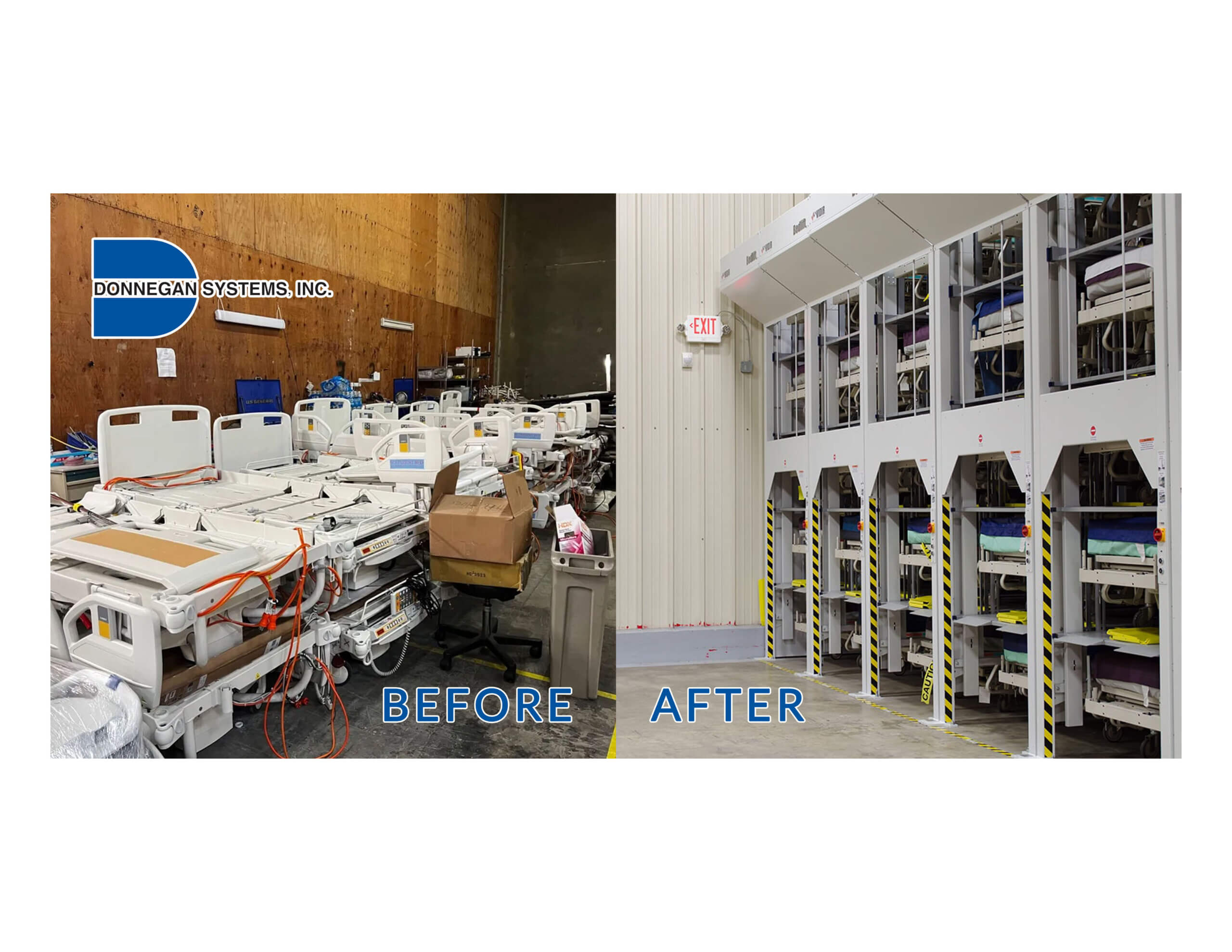 The “before” image portrays a common scene in many hospitals—a crowded, cluttered storage area for beds and patient room furniture. This disorganized storage not only consumes valuable space but also poses challenges in maintaining cleanliness, locating specific items, and ensuring the integrity of hospital assets. Donnegan Systems’ bed lifts, as depicted in the “after” image, introduce a new level of efficiency and compliance to hospital storage.