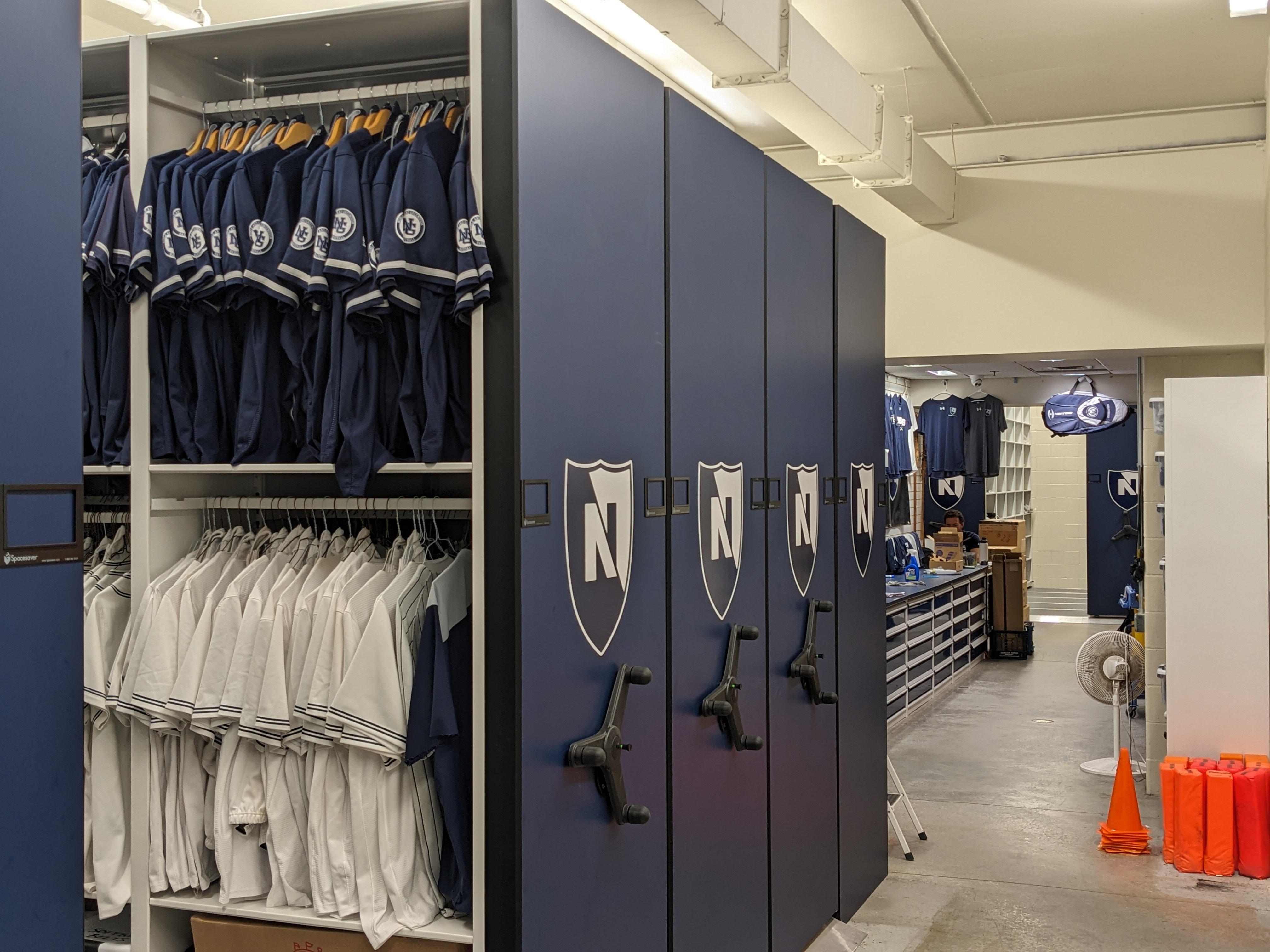 Large gear rooms become streamlined with labeled storage systems for various sports.